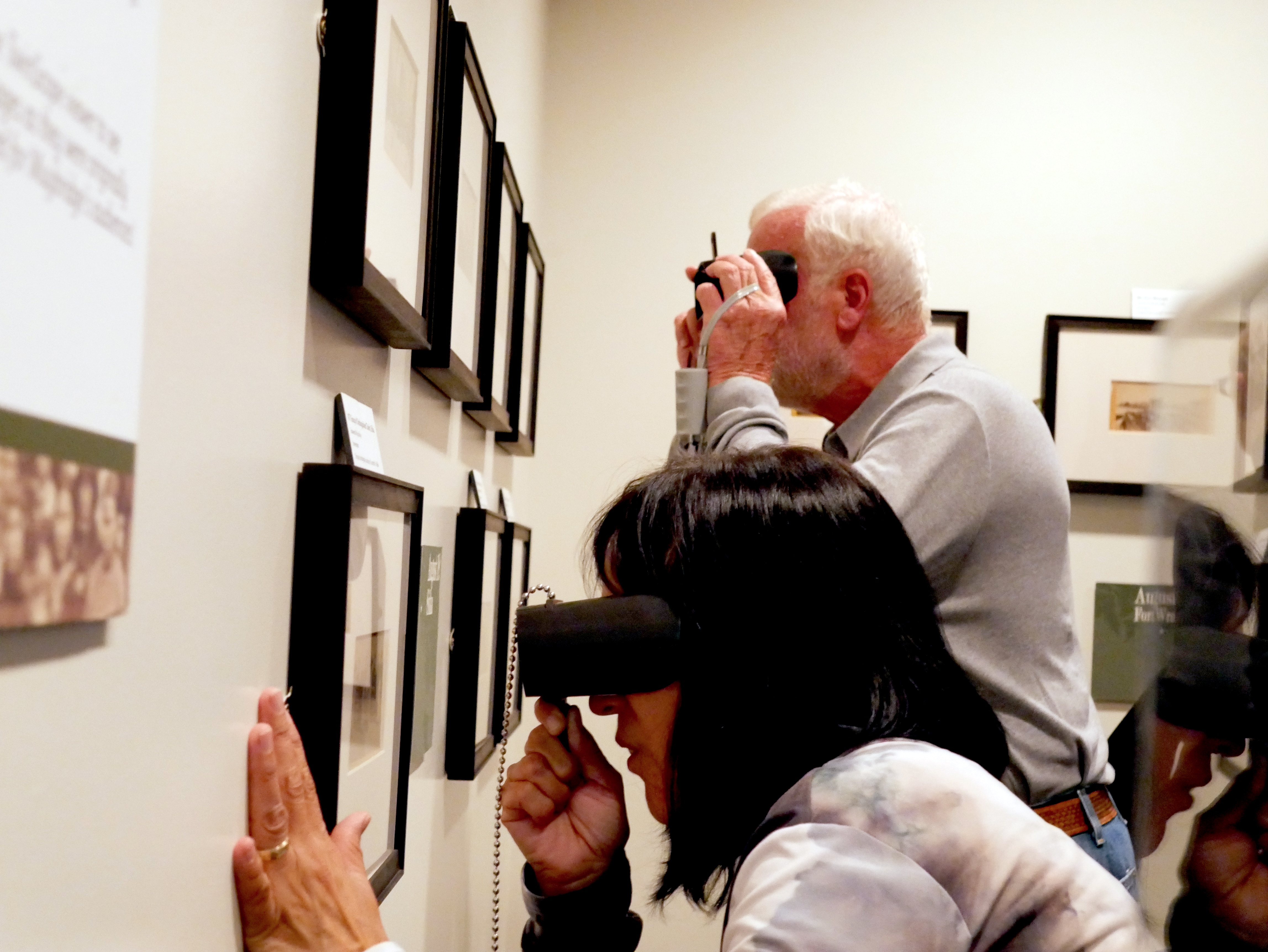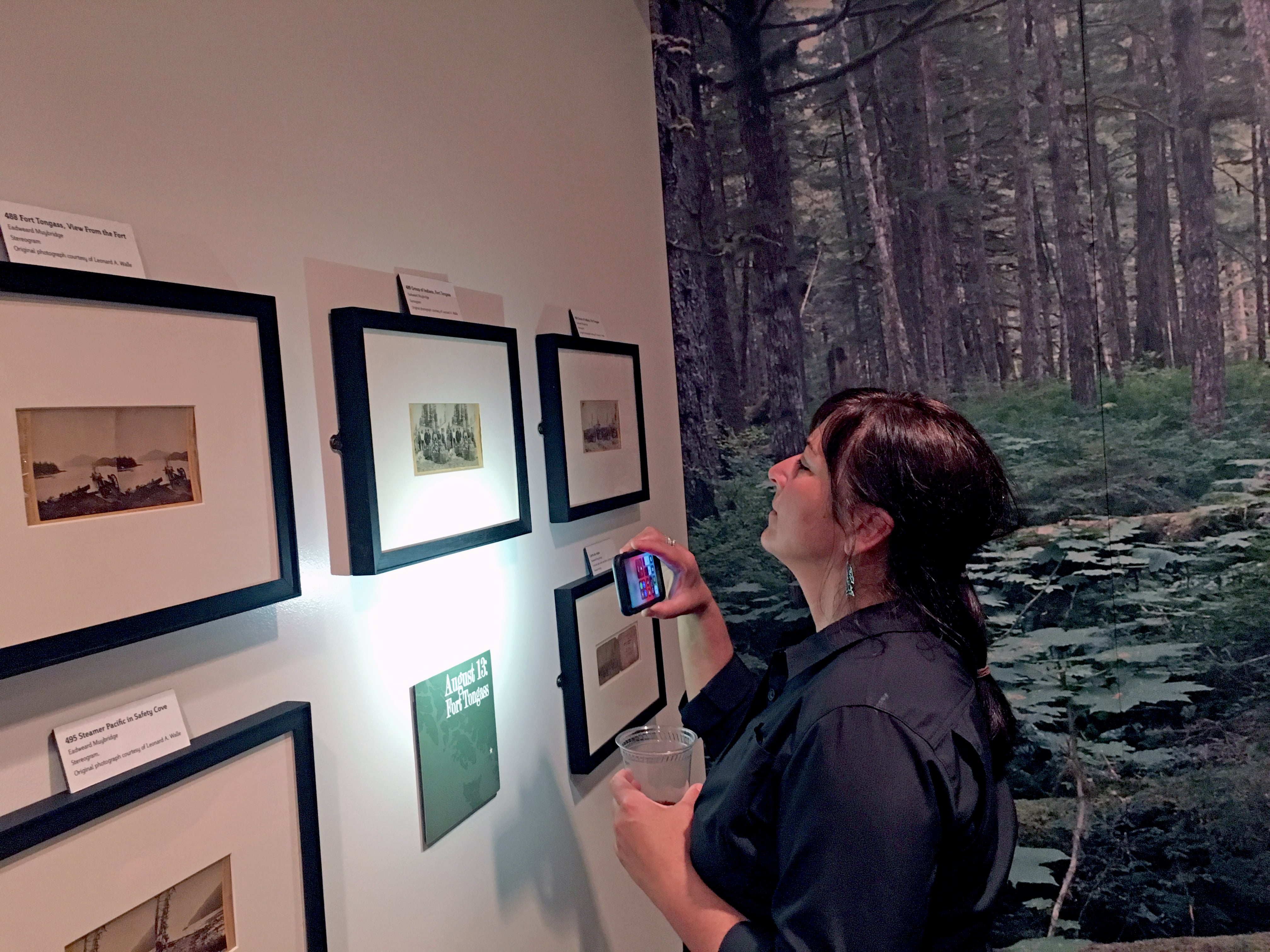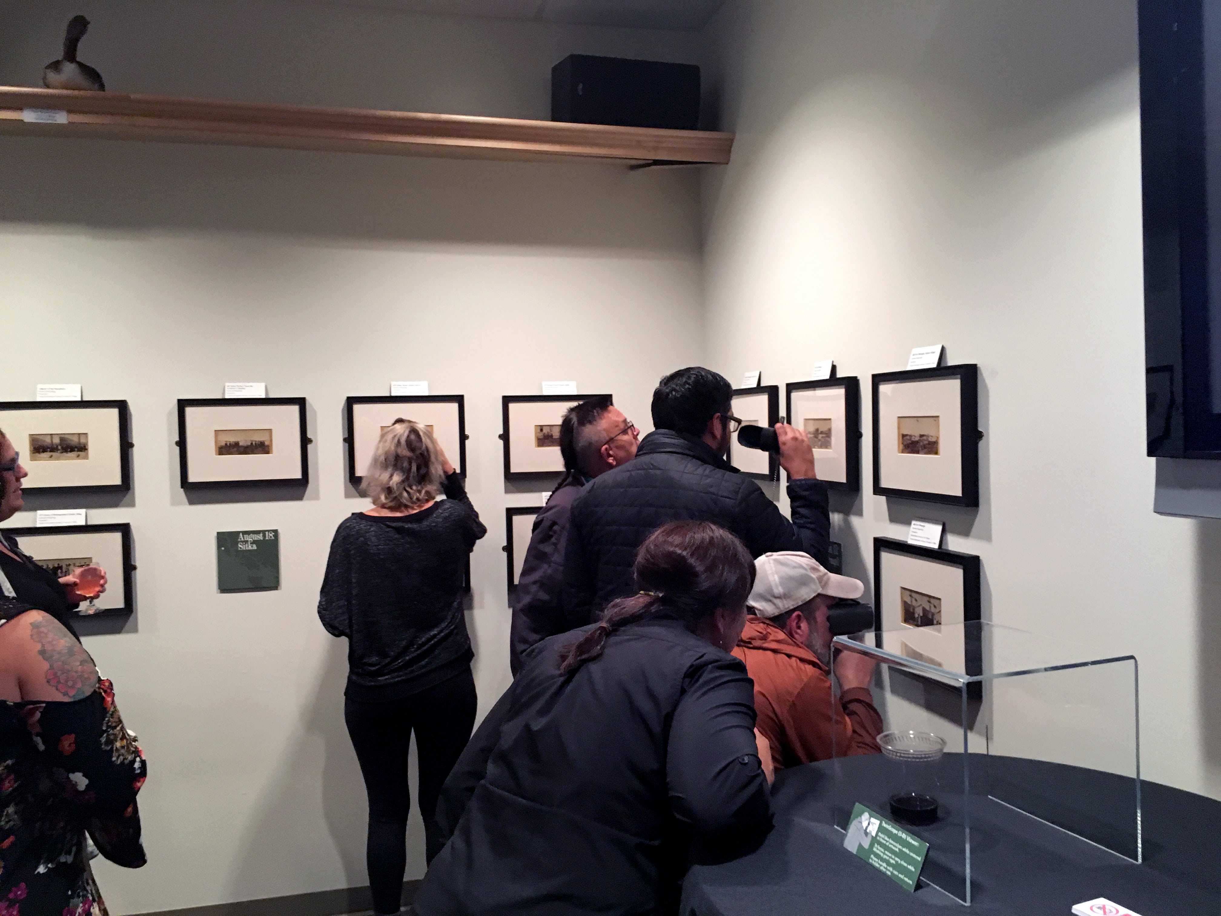Muybridge in Alaska: 1868 opened today at the Alaska Native Heritage Center in Anchorage. Visitors, including some Tlingit people related to figures in the photographs, were delighted to see these original 1868 Muybridge photographs of Alaska, the first of Tlingit people and of the territory to be widely seen. Visitors appeared to be especially excited to view the photographs through special twinscope viewers, produced by artist Colleen Woolpert, that transform the stereo views into single 3D images. Thanks to Loren Anderson and Stephen Blanchett and the ANHC for hosting the exhibition, and to Angie Demma for production support. We are indebted to our sponsors: the Atwood Foundation, the Alaska Humanities Forum, and the Rasmuson Foundation through the Harper Arts Touring Fund of the Alaska State Council on the Arts. A final shout out to Mary Everson who shared her family’s very rare photograph, inscribed by Muybridge, that features her ancestors, and to Len Walle who lent 16 cherished Muybridge stereo views and has been a valued partner throughout the planning and execution of the show.