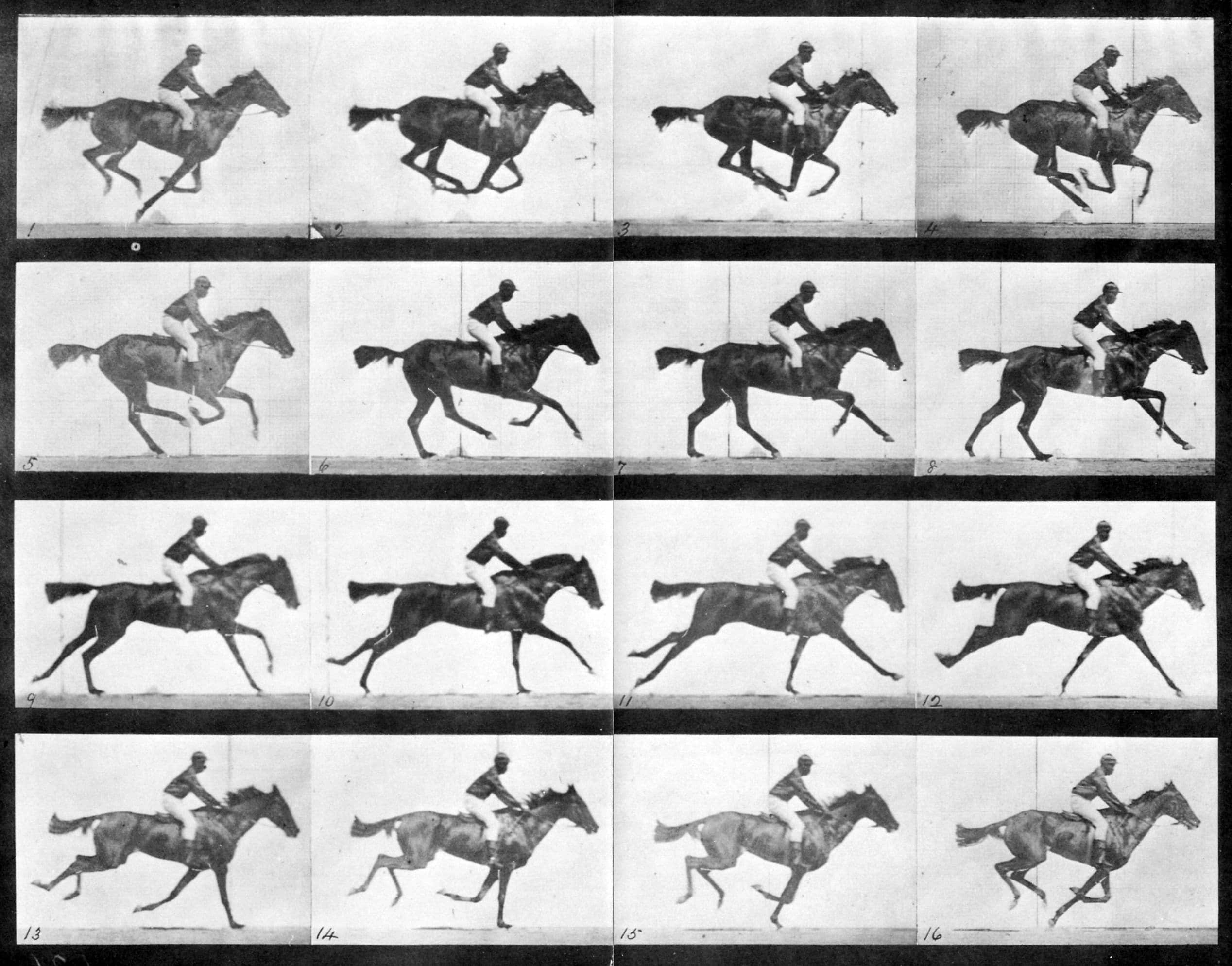 As we celebrate Martin Luther King, Jr., and the continuing struggle for racial justice and equal opportunity, we present one of Muybridge’s motion studies from his magnum opus, Animal Locomotion, published in 1887 under the auspices of his benefactor, the University of Pennsylvania. Today, the work is considered a masterpiece, but Muybridge had a difficult time finding buyers. Spooked by the many images of nudes, the University set a high price on the work, hoping to prevent the unwashed masses from seeing the objectionable photographs. It is often said, including in our film, that there is but one photograph of an African American model—Ben Bailey, “the mulatto pugilist.” And it is true that Bailey is the sole Black subject among the hundreds of men and women photographed by Muybridge. However, he is not the only African American to appear in the photographs. In one of the better known studies, plate 626, Annie G., Muybridge photographs a horse at a gallop. The rider, who is not identified, is African American. In the decades between the end of slavery and the institution of Jim Crow segregation, African Americans enjoyed enormous success as jockeys. In the first Kentucky Derby, 13 of 15 jockeys were Black, including the winner, Oliver Lewis. African American jockeys won 15 of the first 28 Kentucky Derbies. Perhaps the most successful was Isaac Murphy. Born into slavery in 1861, Murphy won three derbies, and in 1955 was the first jockey inducted into the sport’s hall of fame.