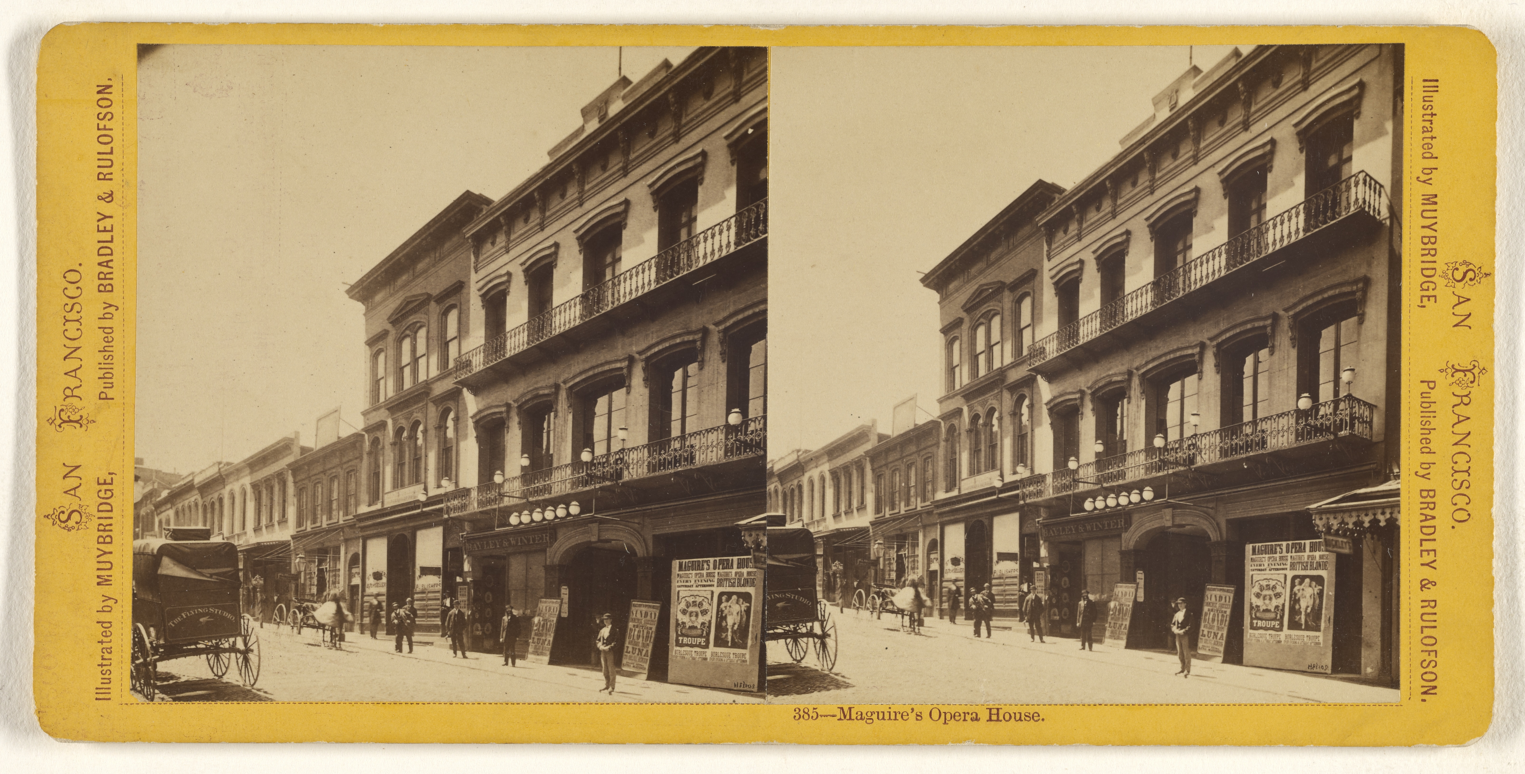 Maguire’s Opera House. 1870. Presented in honor of the new year, and looking forward to once again gathering together in theaters to watch opera, movies, concerts, and more. Located at 618 Washington Street in San Francisco, Maguire’s Opera House opened in 1856 as the first theater in the city built for opera. Before it closed in 1873, Maguire’s also hosted minstrel shows, burlesque, farce and melodrama. This is a very rare photograph, one of only two we have seen in which Muybridge prominently features his horse-drawn photography studio, which he called The Flying Studio. Muybridge was working with wet-plate photography, the technology of the time, in which he would have to apply a chemical solution to a glass plate, expose the plate, and develop the photograph, all on location. Note under the show posters at lower right, he signs the photograph Helios, a pseudonym he would soon discard. Of interest, a few years after Muybridge made this photograph, he married Flora Shallcross Stone, an attractive woman half his age who loved to go to the theater. When Muybridge was away on photography expeditions, a handsome, charismatic theater critic named Harry Larkyns began taking Flora to the theater. As scholar Marta Braun says in the film, “This spells trouble!”