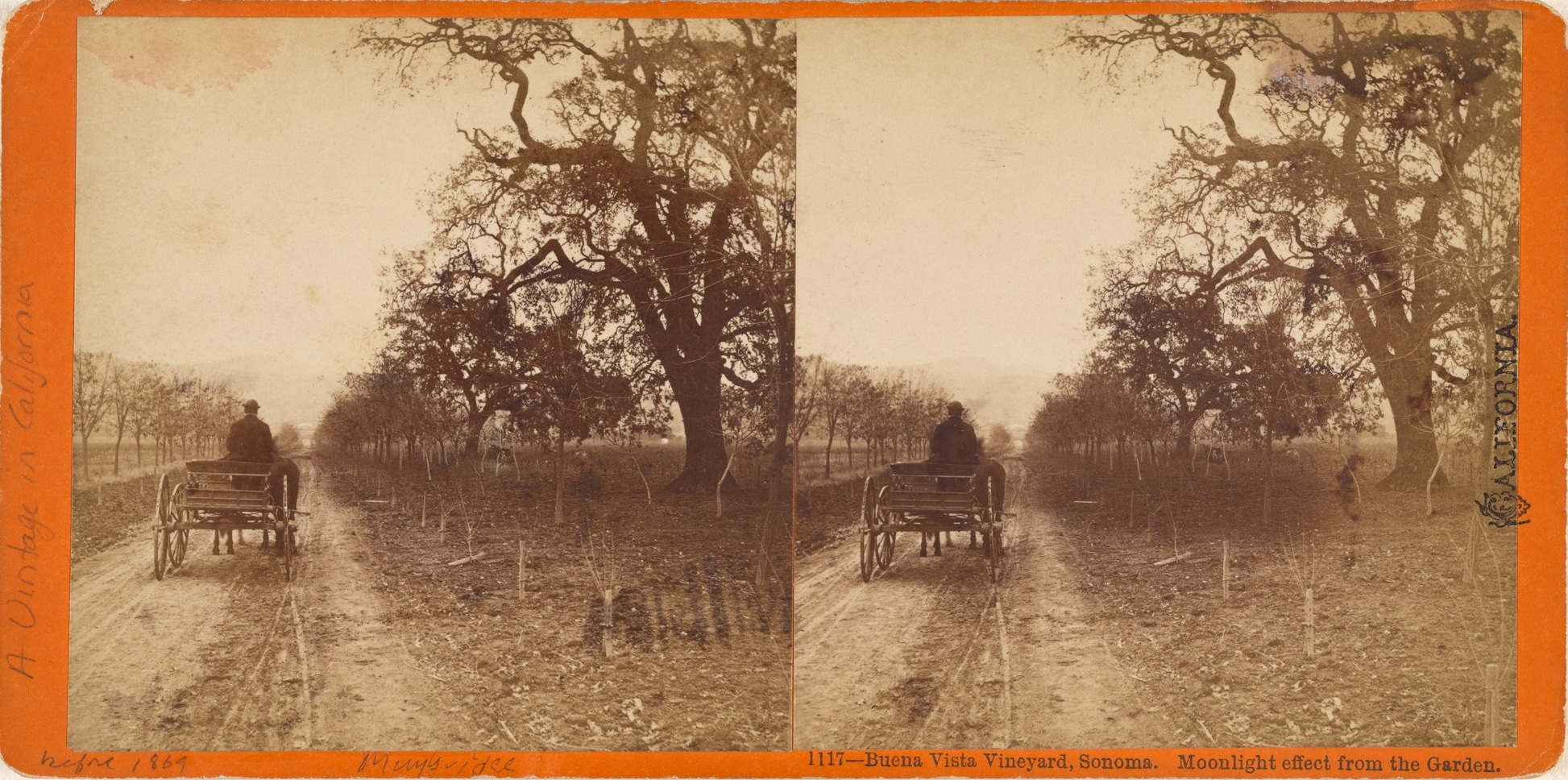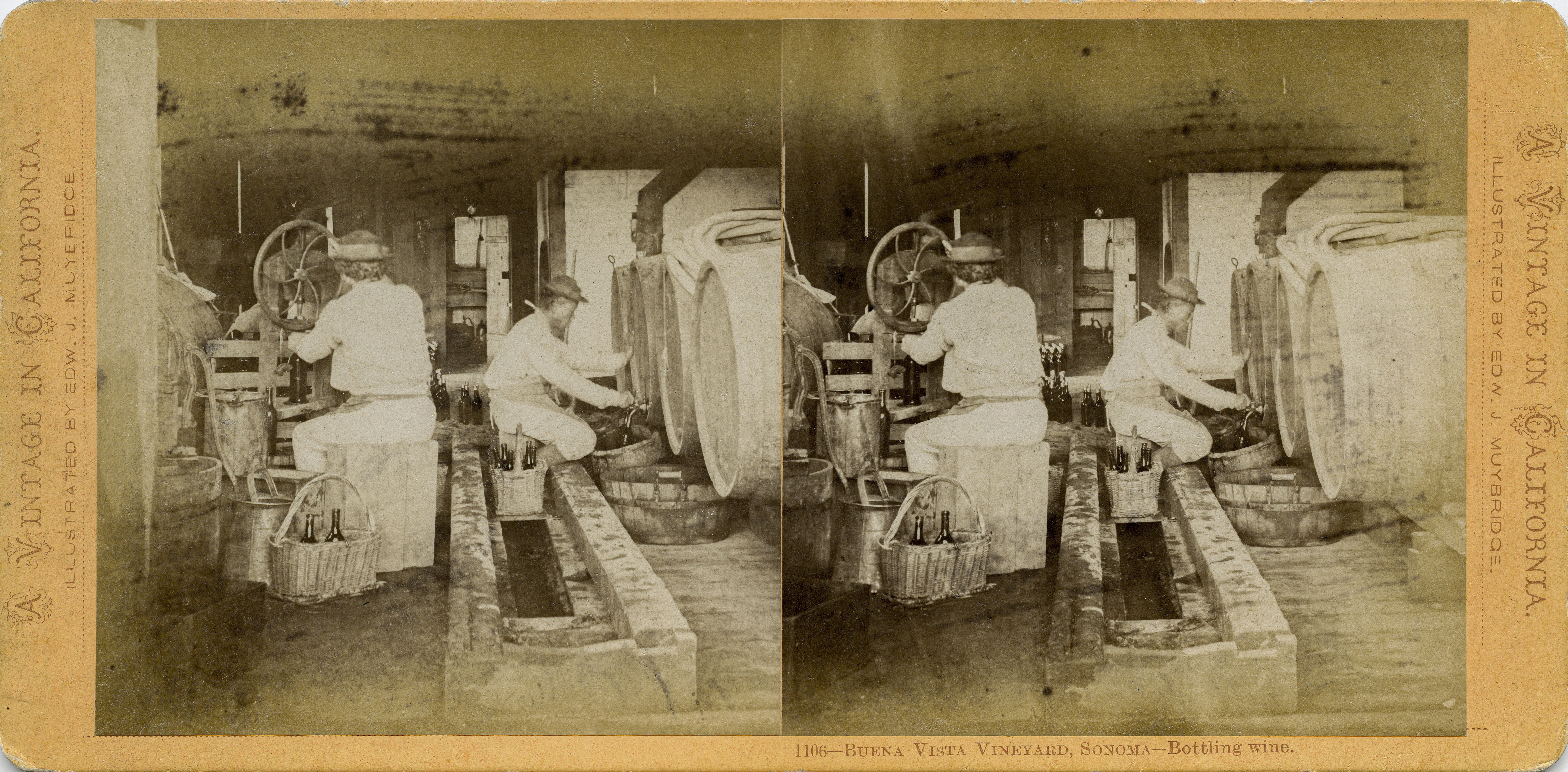 In honor of our selection to screen at the 25th annual Sonoma International Film Festival, the West Coast premiere of Exposing Muybridge, we share two photographs Muybridge made in 1871 at the Buena Vista Winery in Sonoma, the first ever made of winemaking in Northern California. “Although the manufacture of wine is yet in its infancy in California,” Muybridge wrote, “in a few more years California will be one of the greatest wine growing countries in the world.” Wine historian and writer Charles Sullivan called the photographs, “the greatest nineteenth century collection of winery and vineyard photos in the world.” In the first stereo view, note the Chinese man on the right. Chinese workers were imported to work on the transcontinental railroad and, after its completion in 1869, migrated to San Francisco and other places in the West, including Sonoma where they constituted an important part of the wine industry’s labor force. The second view is incorrectly dated “before 1869.” The composition is typical of Muybridge, with figures photographed from behind often looking off towards a vista. This framing was motivated not only by Muybridge’s distinctive aesthetic but also to enhance the three dimensional effect when viewed through a stereoscope.
