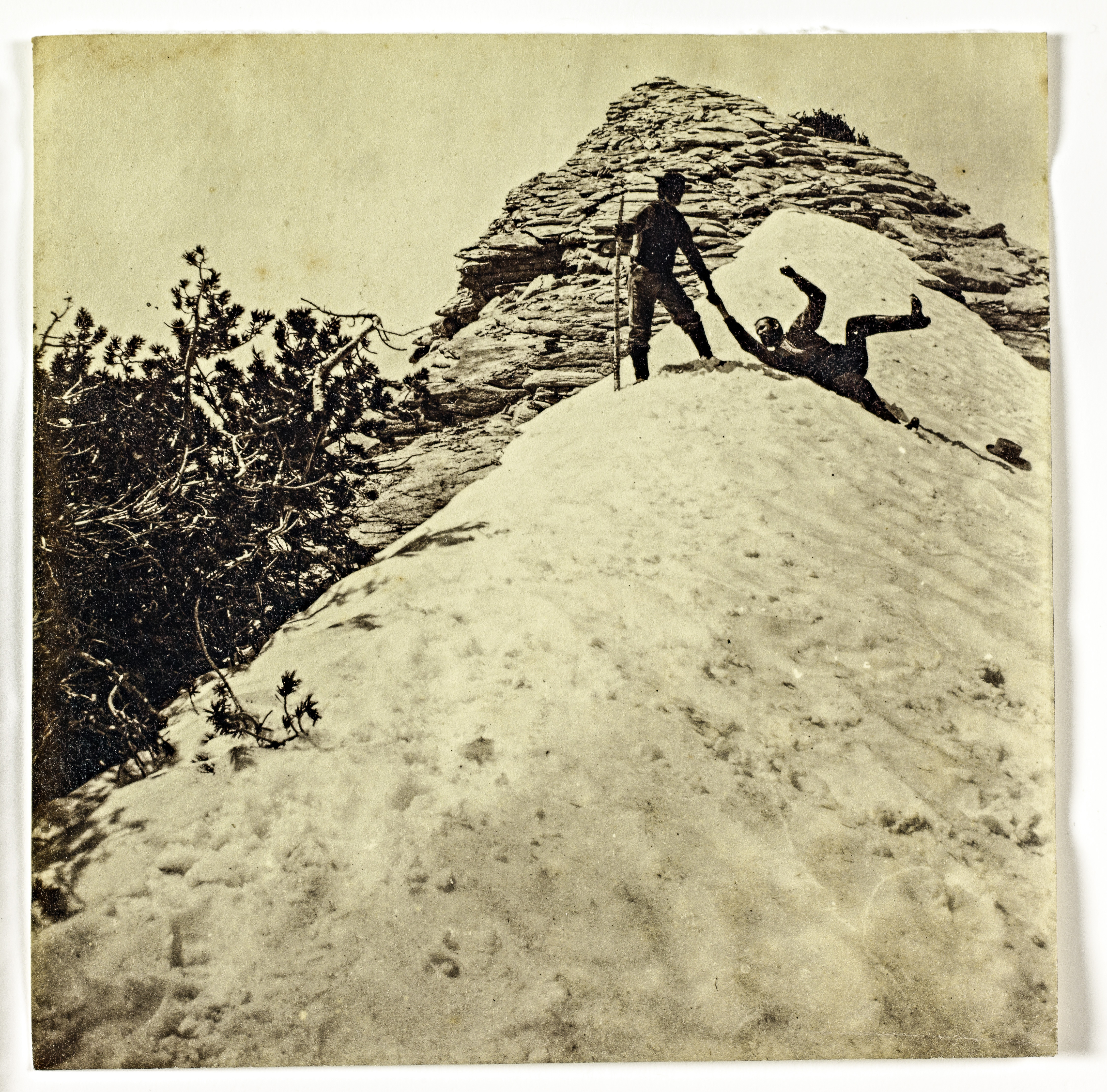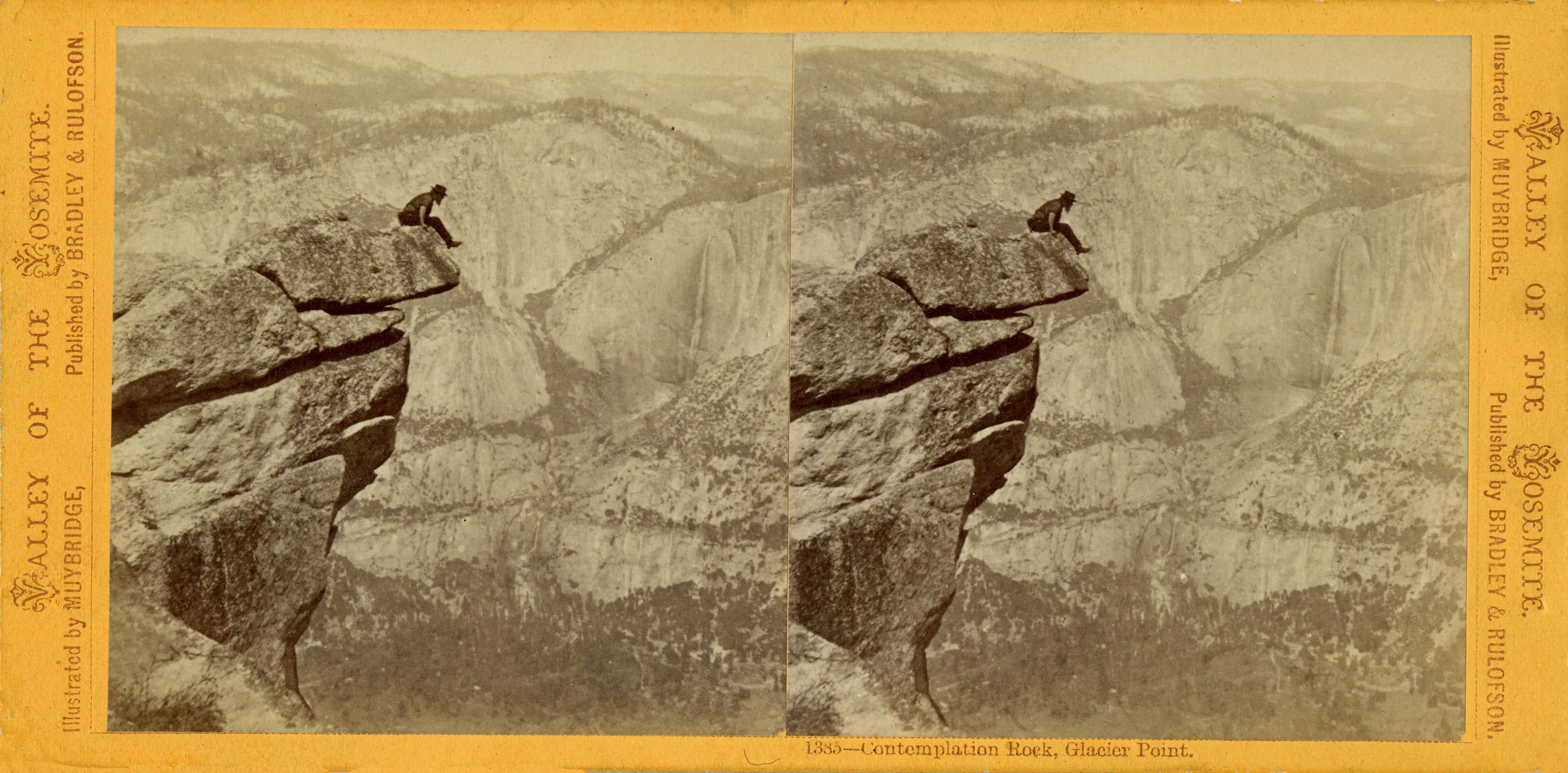 We begin with Contemplation Rock, Glacier Point. Muybridge was the fourth to photograph Yosemite Valley. This he made during his second photographic expedition there in 1872. The stereo view shows Muybridge himself dangling 3000 feet above the valley floor. Stereo photographs were made with double-lensed cameras and produced two side by side photographs that were nearly identical. When placed in a special viewer, the images merged together to produce an optical illusion of a single three-dimensional image. This photograph was presented by Muybridge’s defense attorneys at his 1875 murder trial as proof of his insanity.