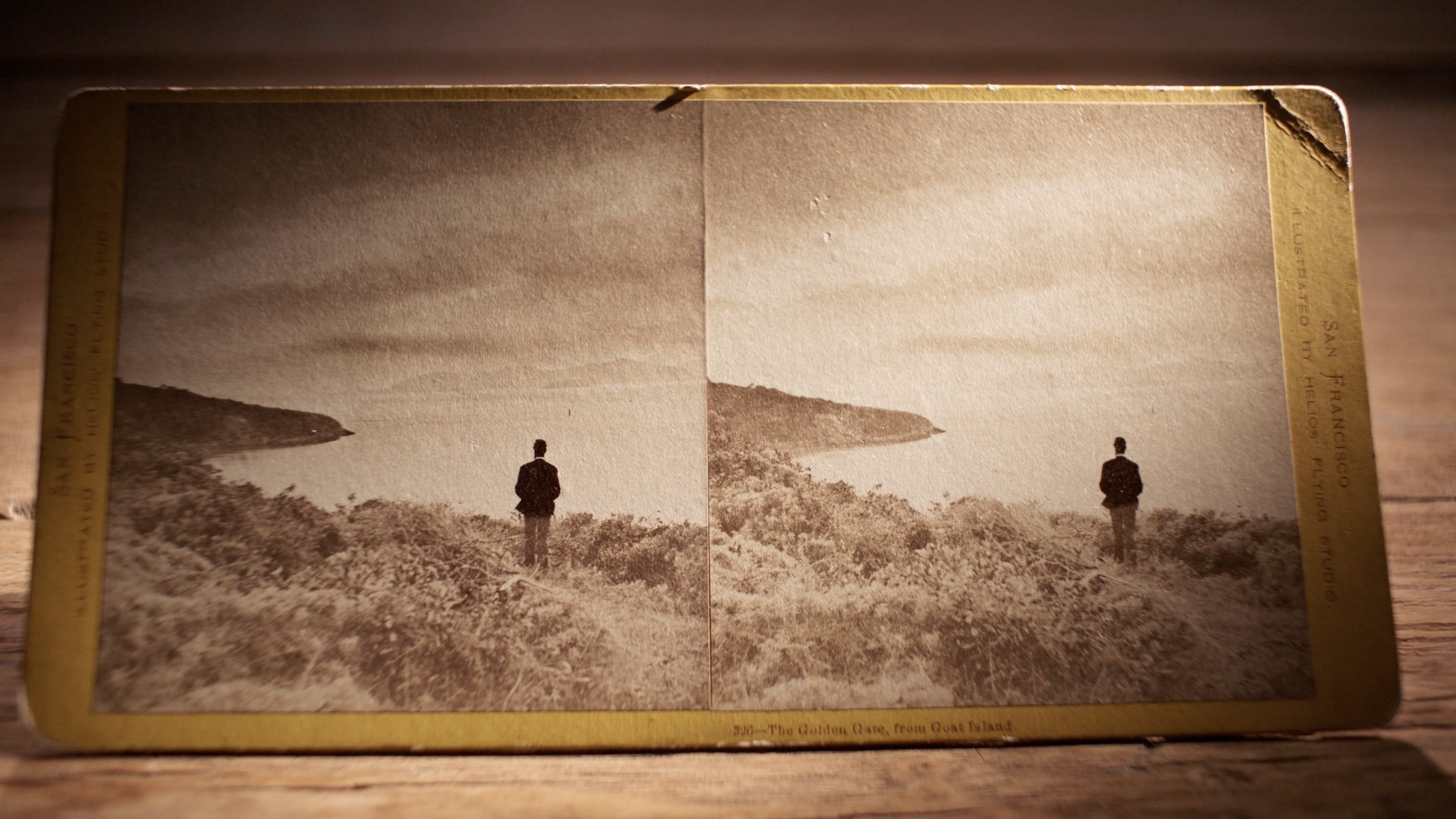 Screen shot from Exposing Muybridge documentary of Golden Gate, From Goat Island, 1870. From the collection of Gary Oldman and Gisele Schmidt. Goat Island, now known as Yerba Buena Island, sits in the middle of the bay between San Francisco and Oakland and today serves as the junction point between the two spans of the Bay Bridge. In his landscapes, Muybridge often photographed subjects with their backs to the camera, drawing the viewer to the distant horizon. This was one of the first Muybridge photographs director Marc Shaffer saw that sparked his interest in the photographer.