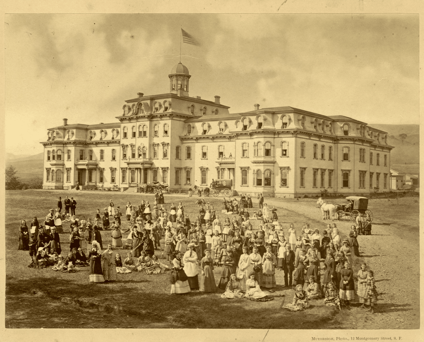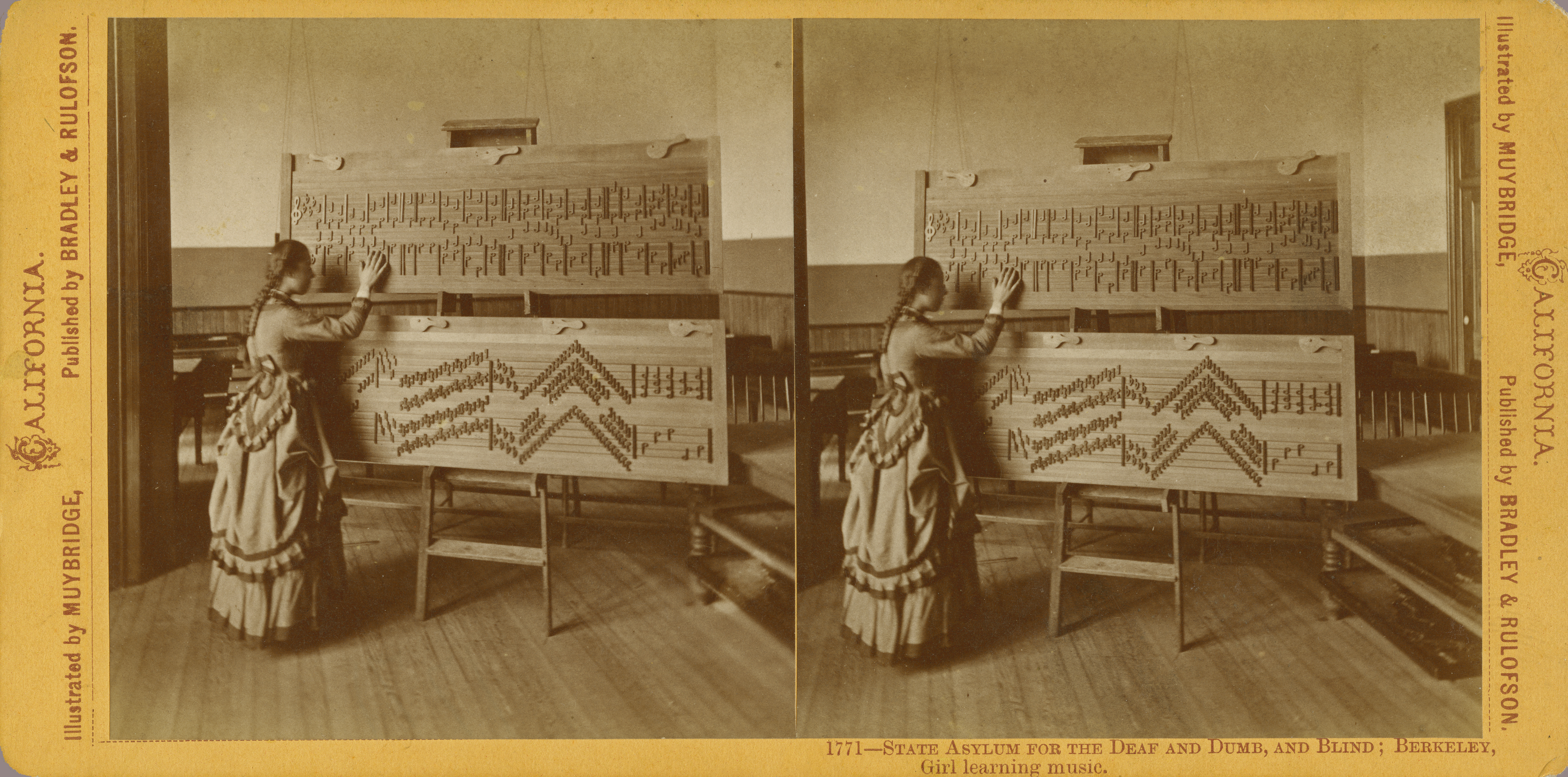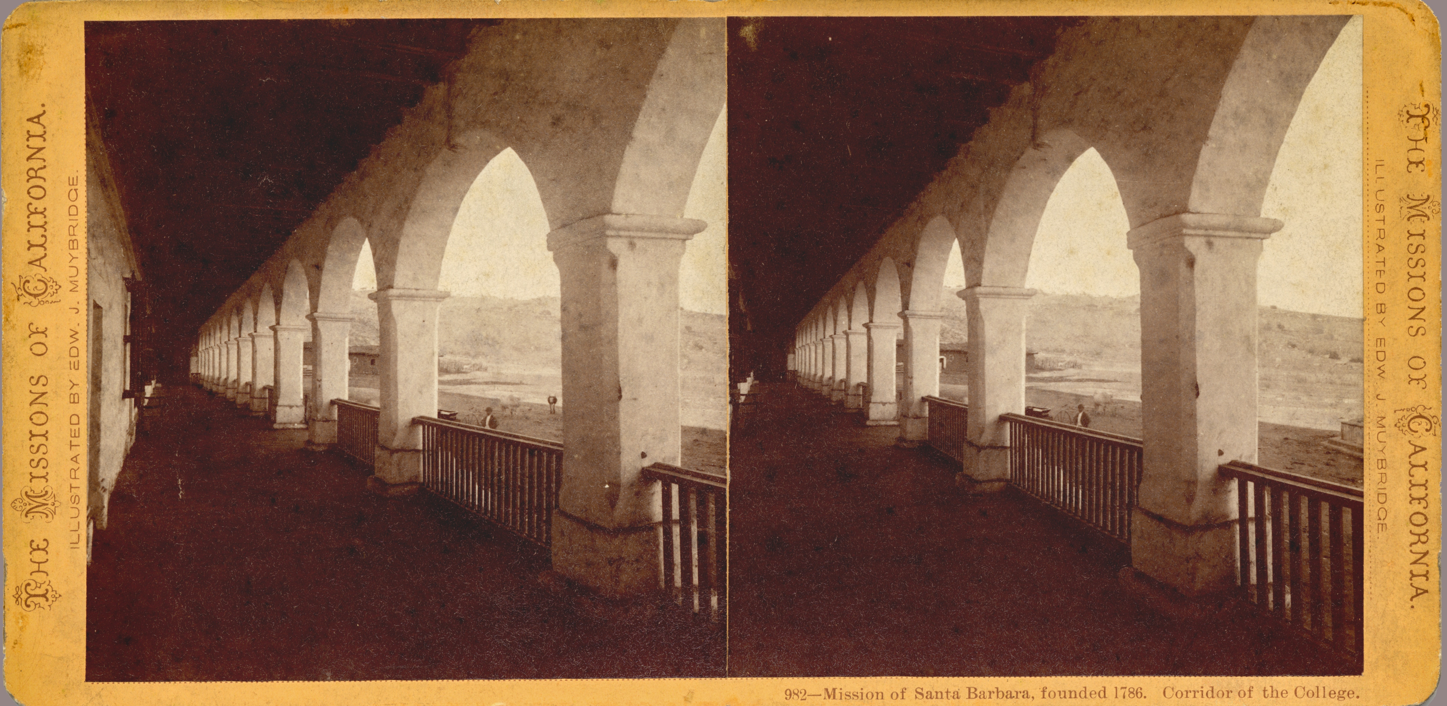 Connecting dots between then and now, tonight Marc Shaffer will screen Exposing Muybridge and answer questions at the Carsey Wolf Center at U.C. Santa Barbara, and so we share a few relevant Muybridge photographs. The first is of the Santa Barbara mission in 1871, and the next two depict educational themes: a young woman learning music at the state aslyum for the deaf and dumb, and blind, in Berkeley, California, where Shaffer was born and raised; and a view of Young Ladies Seminary (now Mills College) in Oakland, where he lives now, both circa 1873-74.